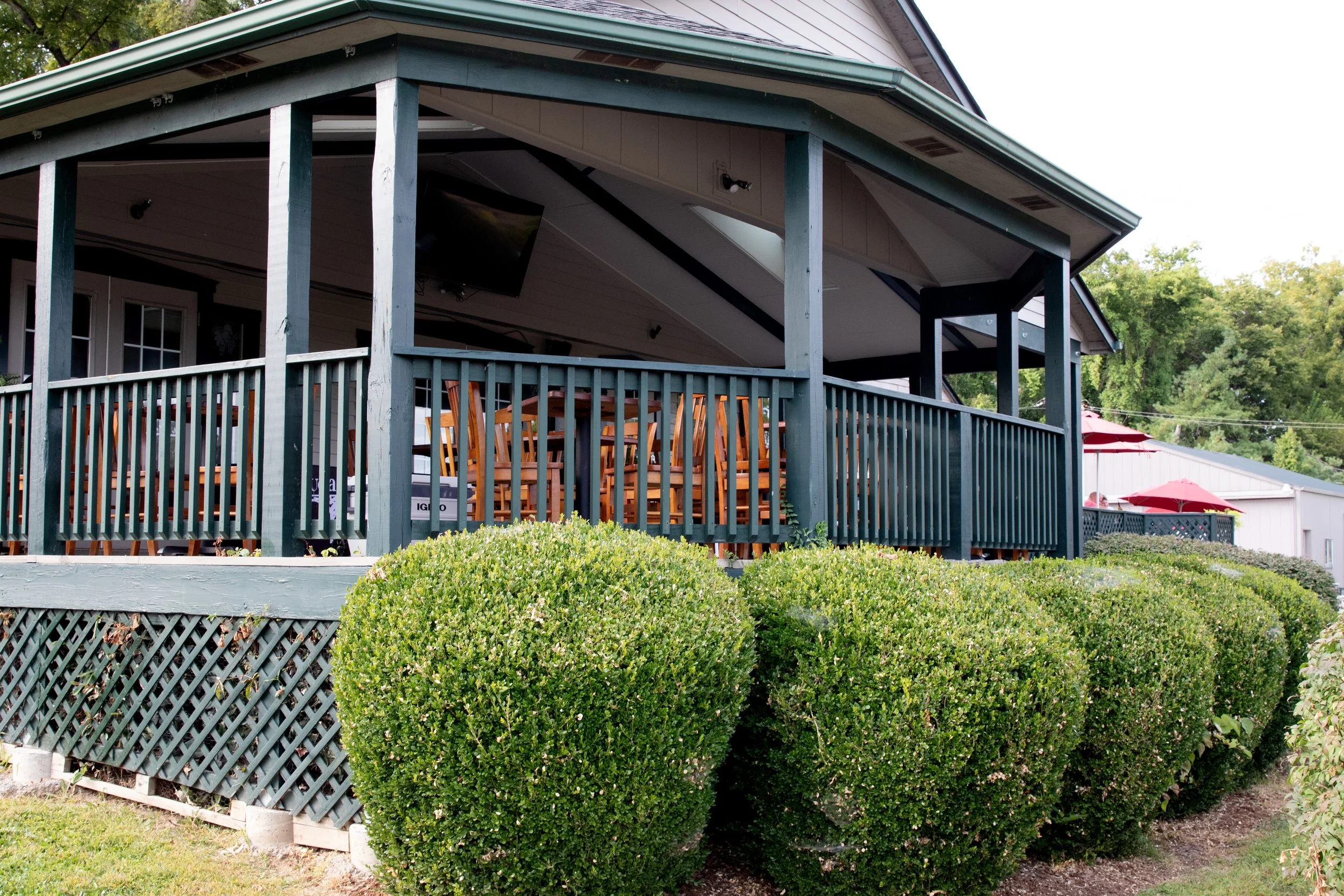 There are many tables with umbrellas available throughout our deck, which stretches across two sections of our tasting room. Seats 8-12 each deck.
